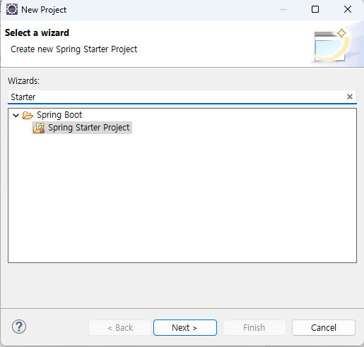 다이얼로그에서 Spring Starter Project 선택 후 Next 클릭