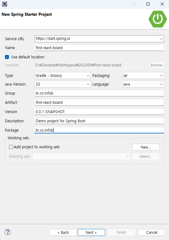 · 만약 생성 시 "No locally installed toolchains match and toolchain download repositories have not been configured." 오류가 발생할 경우 https://kamsi76.tistory.com/entry/Gradle-No-locally-installed-toolchains-match-and-toolchain-download-repositories-have-not-been-configured-%ED%95%B4%EA%B2%B0%EB%B0%A9 참조