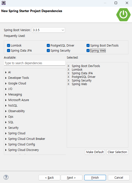 사용할 Dependence 항목을 선택하고 Finish 클릭하면 프로젝트가 생성이 된다.